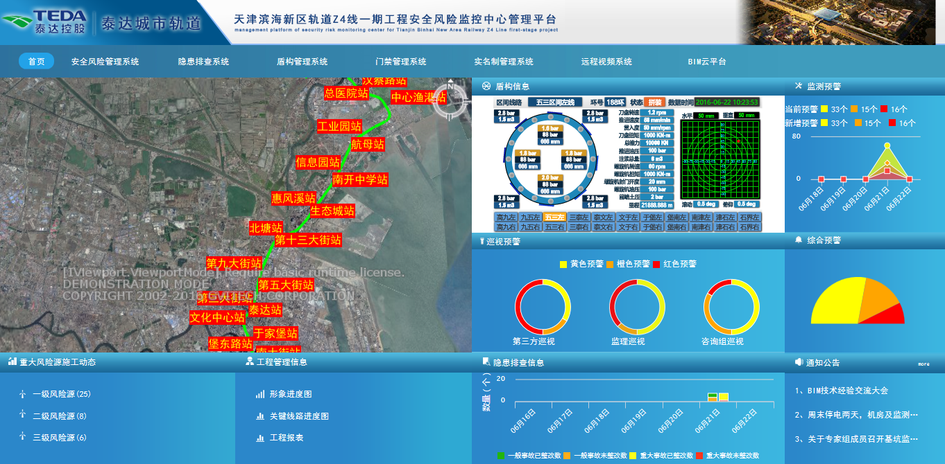 国内首创将BIM-GIS技术引入安全风险管控系统,通过安全巡视与风险源信息录入,测组测点以及监测数据录入,结合BIM三维模型,实现Z4线安全风险的实时监控与空间定位展示。