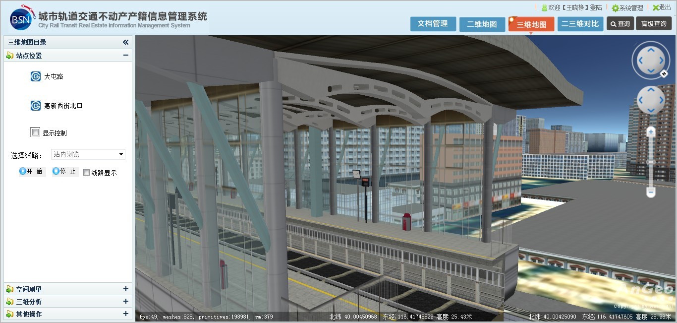 北京地铁五号线不动产管理系统以地形数据、地理数据、地铁线路数据、卫星遥感影像数据、三维模型数据等基础地理信息数据,构建地铁不动产资产基础地理信息数据库。该系统同时集成宗地、车站、区间等轨道交通专题数据及文档资料,为各类用户提供资源共享窗口,为管理和决策提供准确、有效的统计信息。