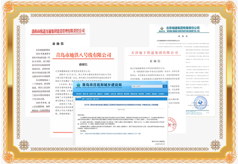 青岛市市政工程管理处授予我院“先进单位”称号;佛山市轨道交通局、北京市通州区住房保障事务中心、北京市规划和自然资源委员会怀柔分局等对我院在“佛山市城市轨道交通三号线监测”、“通州经济开发区西区南扩区三、五、六期棚改户改造项目”等项目中的优越表现和服务精神进行通报表扬。包括“埃塞俄比亚迪巴克公路项目”在内的3项海外工程、北京及外埠几十个项目也分别收到北京城建集团、广州地铁集团有限公司、南宁轨道交通集团有限责任公司、沈阳地铁集团有限公司等业主发来的感谢信与先进集体表彰。