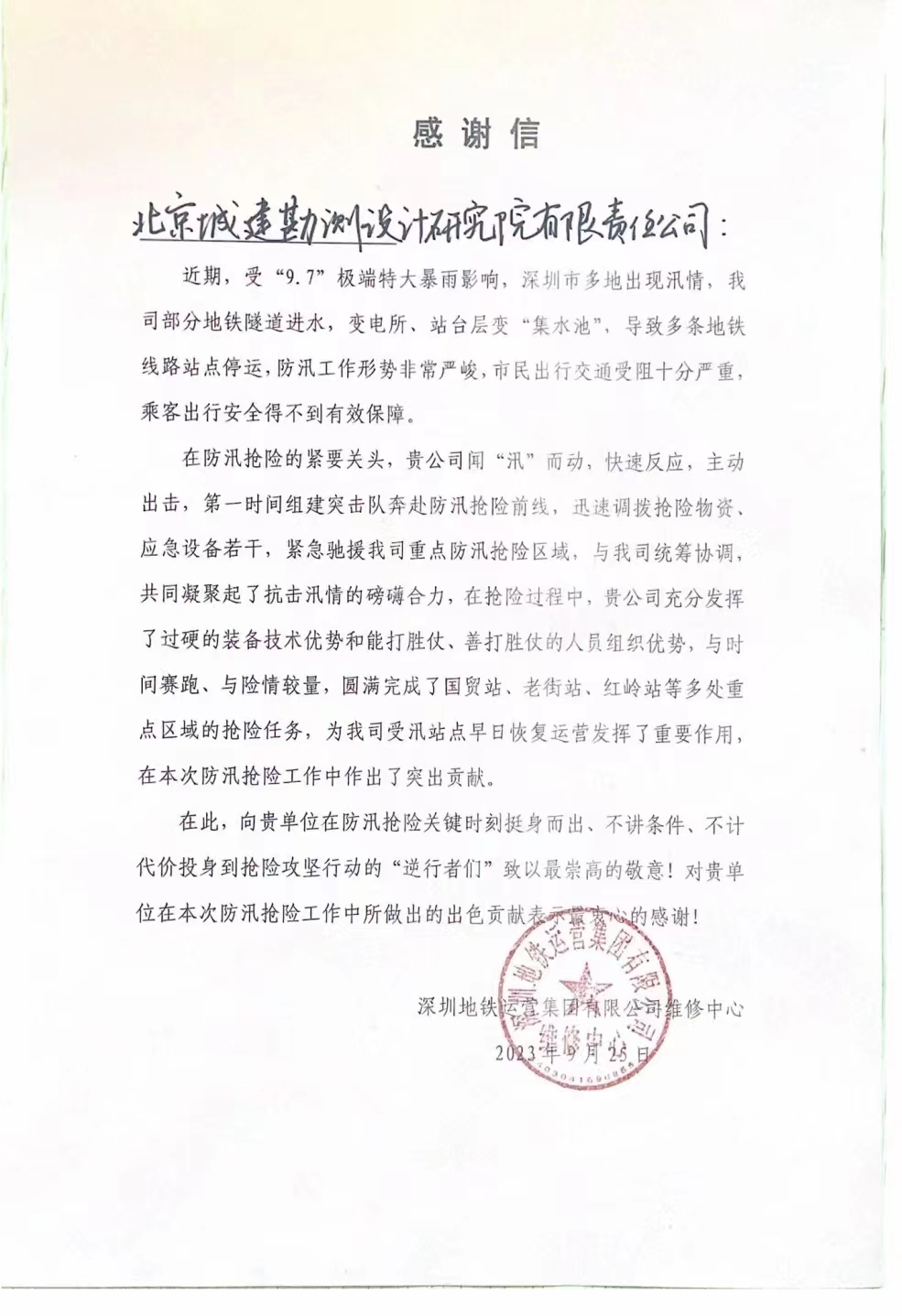 深圳地铁运营集团发来感谢信