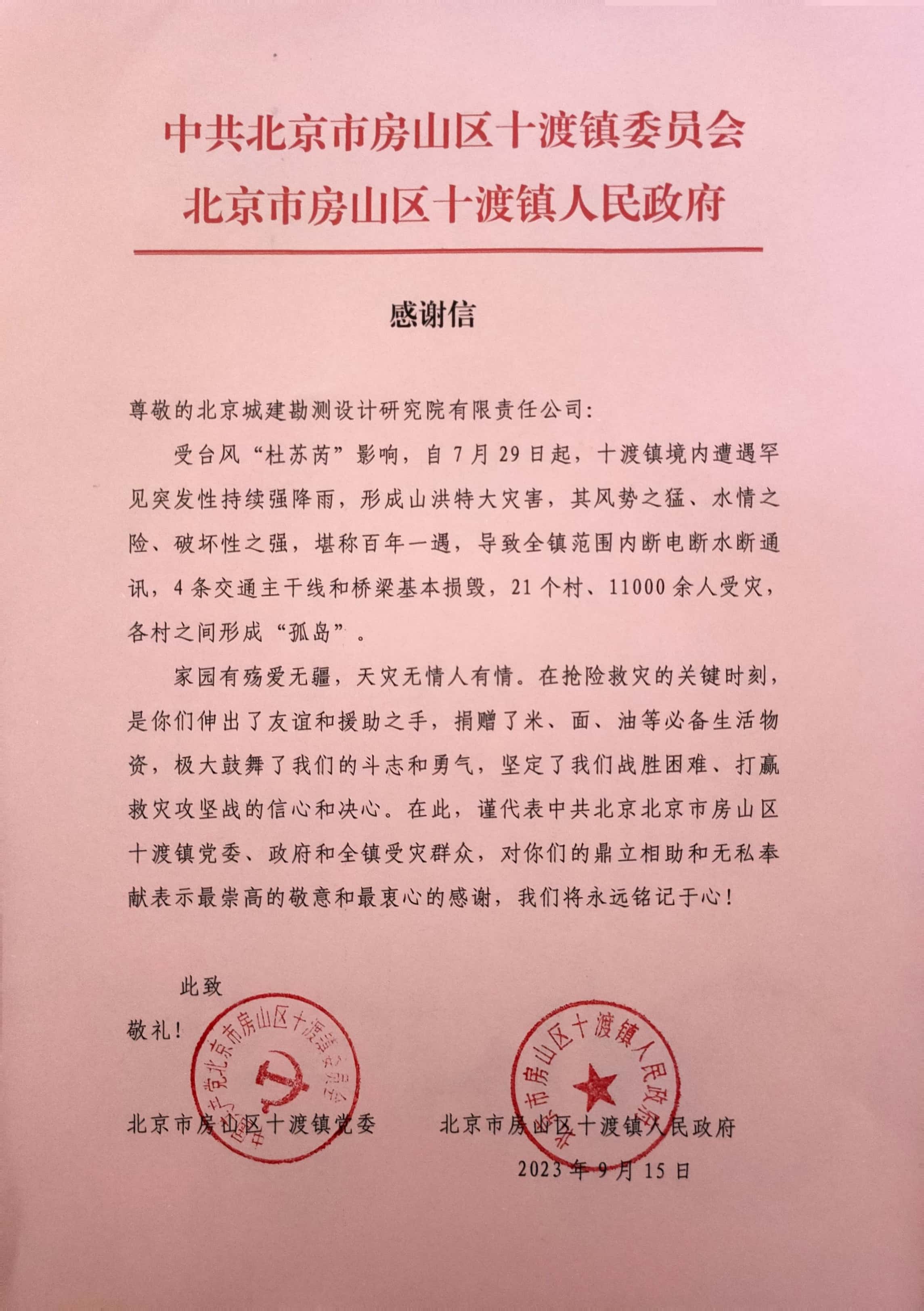 近日,中共房山区十渡镇委员会、十渡镇人民政府,中共房山区蒲洼乡委员会、蒲洼乡人民政府,深圳地铁运营集团先后发来感谢信,对北京城勘院在抢险救灾、服务保障工作中的突出贡献和无私奉献表示感谢。~近日,中共房山区十渡镇委员会、十渡镇人民政府,中共房山区蒲洼乡委员会、蒲洼乡人民政府,深圳地铁运营集团先后发来感谢信,对北京城勘院在抢险救灾、服务保障工作中的突出贡献和无私奉献表示感谢。