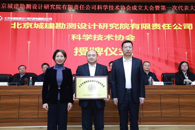 朝阳区科协党组成员、副主席玉红向城勘院科学技术协会授予“北京市朝阳区企业科学技术协会”牌匾,马海志、王思锴接受牌匾。