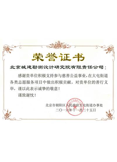 朝阳区大屯街道慈善公益荣誉证书(2016年)