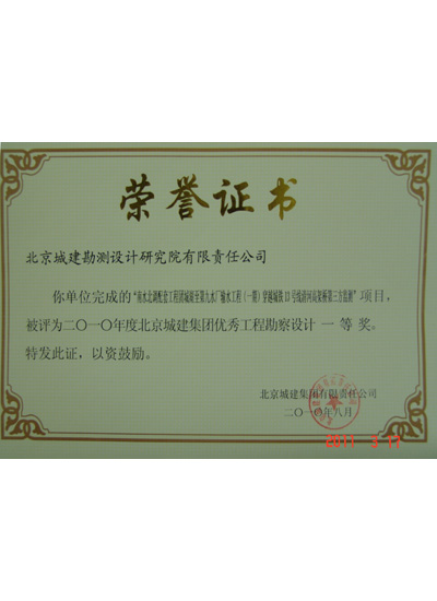 北京城建集团优秀工程勘察设计一等奖(2010年)